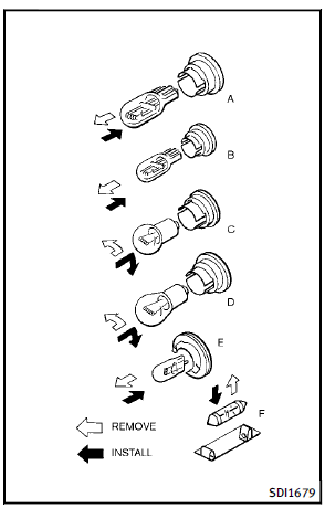 All other lights are either type A, B, C, D, E or F. When replacing a bulb, first remove the lens and/or cover.