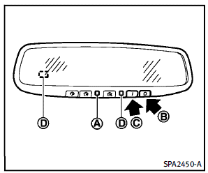 The inside mirror is designed so that it automatically changes reflection according to the intensity of the headlights of the following vehicle. The anti-glare system will be automatically turned on when the ignition switch is pushed to the ON position. When the anti-glare system is turned on, the indicator light A will illuminate and excessive glare from the headlights of the vehicle behind you will be reduced. Push the “” switch B to make the inside rearview mirror operate normally. The indicator light will turn off. Push the “I” switch C to turn the system on. Do not allow any object to cover the sensors D or apply glass cleaner on them. Doing so will reduce the sensitivity of the sensor, resulting in improper operation. For the HomeLink® Universal Transceiver operation, see “HomeLink® Universal Transceiver” in the “2. Instruments and controls” section.